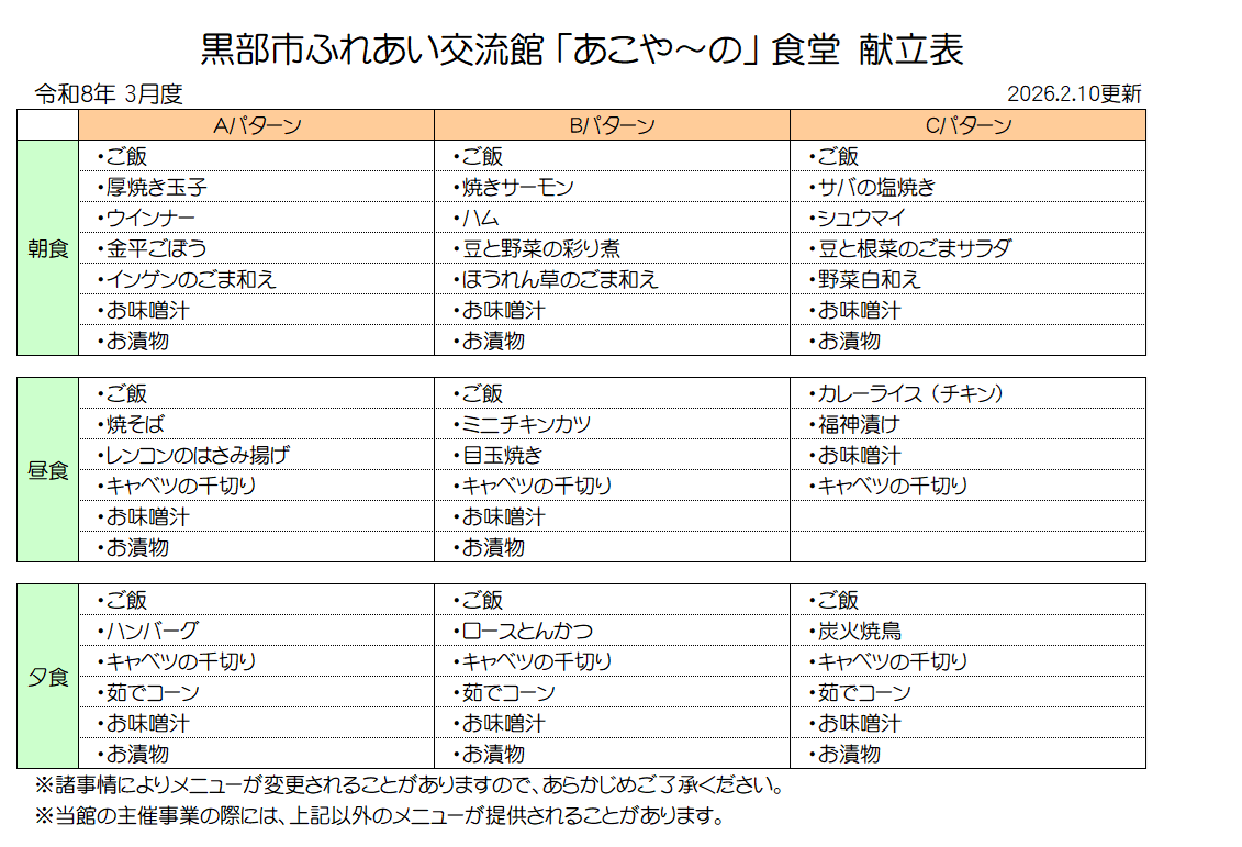 令和8年3月1日(日)より当施設の食堂における食事のメニューは下記の通りです。