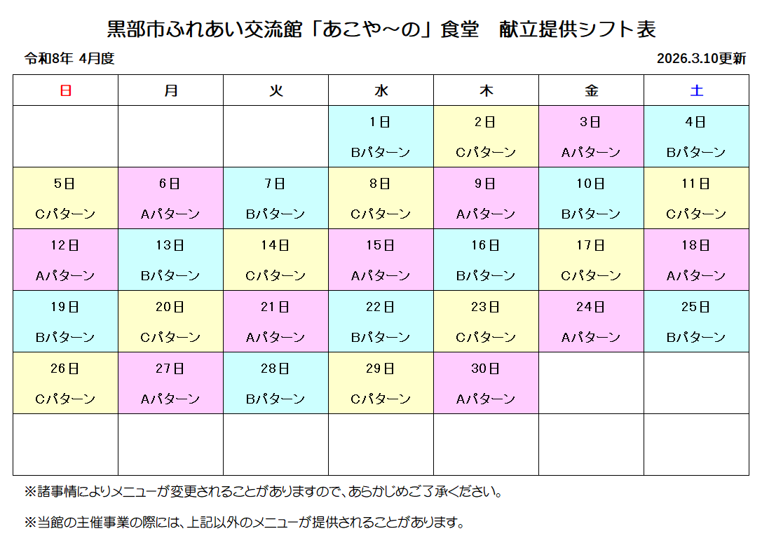 令和8年4月1日(水)より当施設の食堂における食事のメニューは下記の通りです。